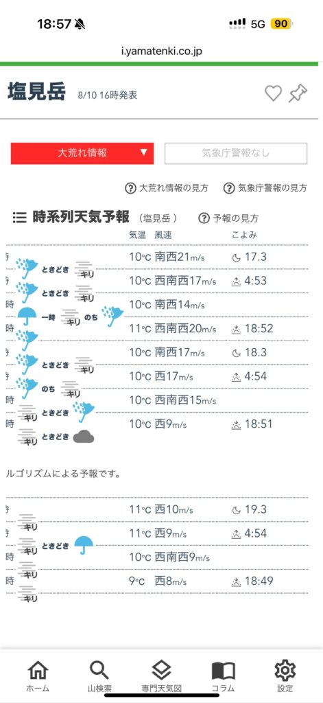 TJAR出場に向けた課題の一つは、**「標高2,000m以上の高地で、2泊3日以上のビバークキャンプを経験すること」です。この準備のため、連休は山に入るようにしています。 今回計画したのは、南アルプスの大半を縦走するルート。しかし山の天気専門サイト「ヤマテン」には、予想通り「大荒れマーク」**が点灯していました。